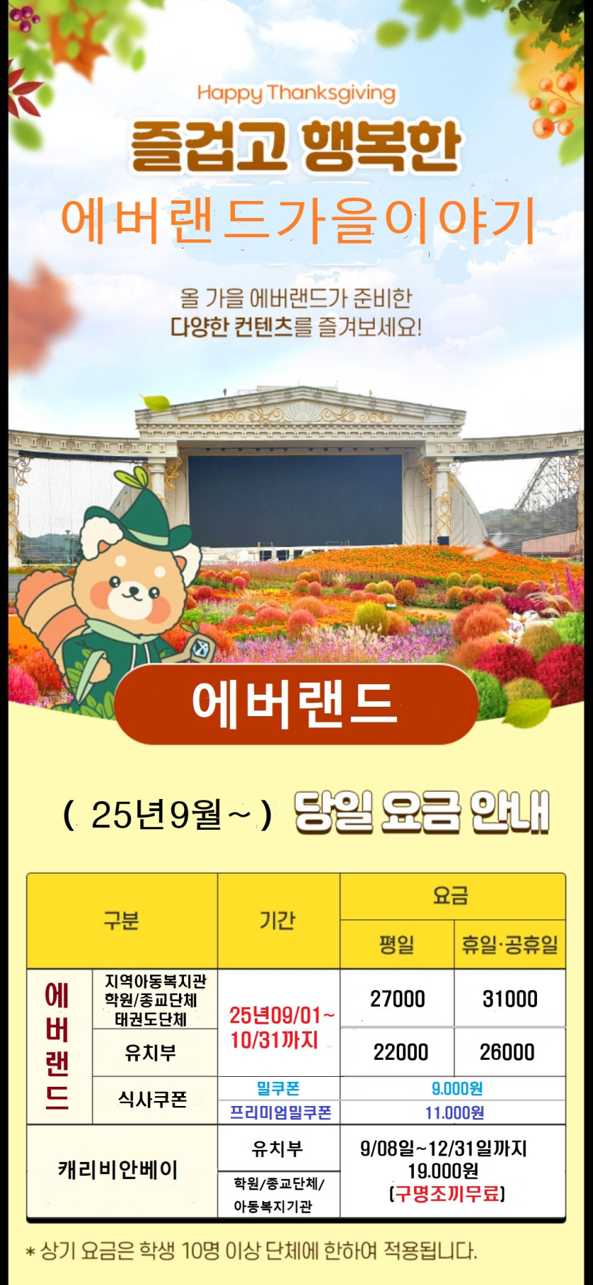 용인 에버랜드& 캐리비안베이 현장학습 페이지 정보 작성자 관리자 댓글 0건 조회 29회 작성일 25-10-16 06:49 본문 용인 에버랜드 현장학습(가을, 겨울) 목록 목록 다음글과천 서울대공원 원더파크 현장학습 25.04.23